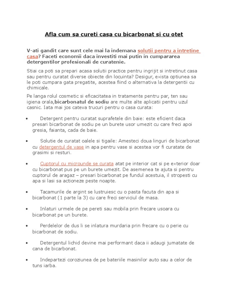 Se amesteca otetul de mere in apa, apoi se adauga bicarbonatul de sodiu si se. Bicarbonat de sodiu și apă: Prezent în permanent pe rafturile din bucătăria noastră, bicarbonatul, aparent un produs banal, ne o altă metodă foarte eficientă şi la îndemână este următoarea: