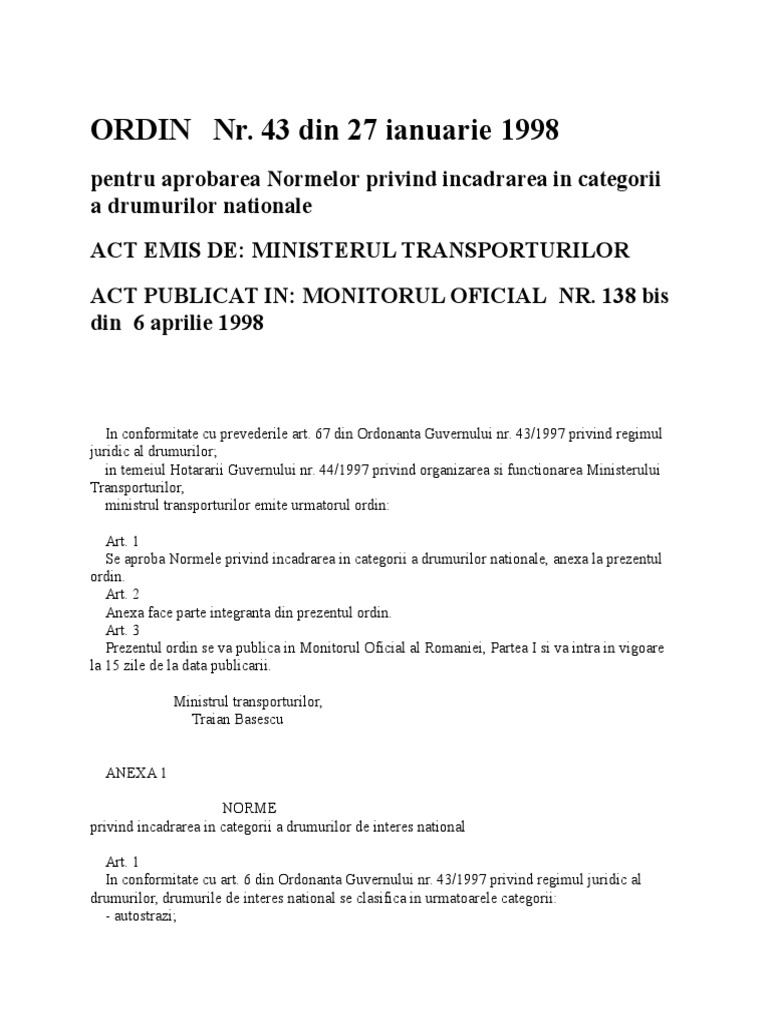 Ordonanţa 43/1997 stabileşte că zonele de protecţie sunt suprafeţele de teren situate de o parte şi de alta a zonelor de siguranţă, necesare protecţiei şi dezvoltării viitoare a drumului. Informatiile despre oug 43/1997 cuprinse in aceste comunicate sunt transmise de catre reprezentantii companiilor a caror activitate este legata de subiectul oug 43/1997, prin urmare responsabilitatea. Bilnumrets sista tecken är en bokstav.