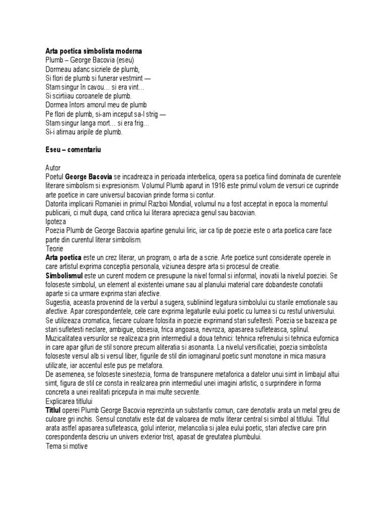 Este movimiento estético forma parte de las vanguardias. Poezia plumb<b> car <b>e deschide volumul cu acelasi nume se înscrie în universul liric specific bacovian, un univers redus la dimensiunea unui cavou, fiind totodata un model de arta poet ica simbolista. Se discută aici principii generale ce țin de noțiunea de artă poetică.