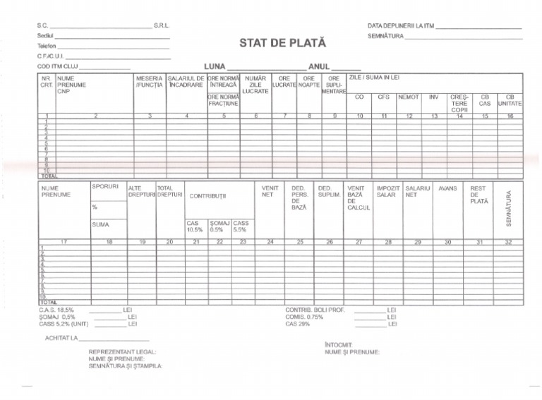Pentru toţi aceia care folosesc muncă salariată dar,mai ales pentrui întreprinderi individuale şi pfa doresc să vă pun la dispoziţie un model de stat de salarii, fără bonuri de masă,valabil de la 1 ianuarie 2021 model stat excel. Your browser must accept cookies for you to be able to log in to this site and download stata. Zece lucruri bine de știut despre statul de plată.